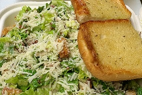 Romaine lettuce, Seasoned Croutons, Bacon Bits, Parmesan Cheese and Caesar Dressing
